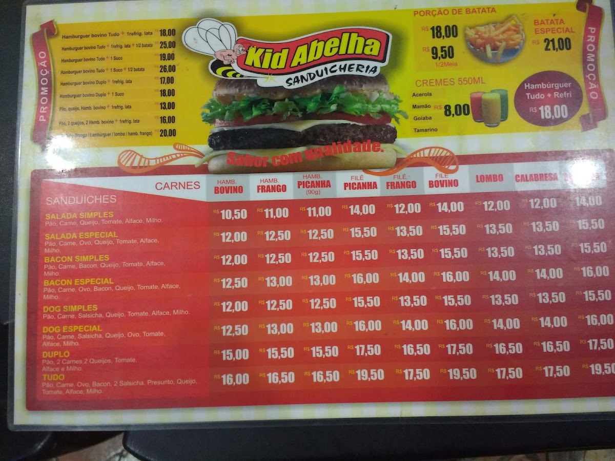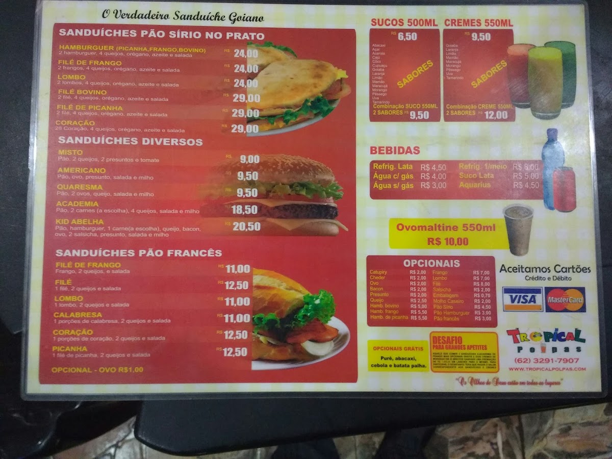 Alongside main sandwiches and burgers, the menu offers several drink options including fresh fruit juices, referred to as "Sucos," and creamy fruit-based beverages like Creme de Morango and Creme de Cupuaçu. There is also draft beer (Chopp) available, catering to those seeking alcoholic refreshments.